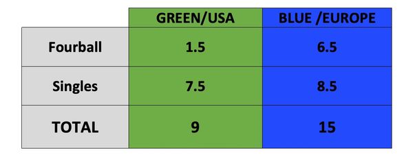 The quality of golf ranged from the sublime to the ridiculous, with an eagle and birdies balanced off with more lost balls than the average FFF Monday night session! Ultimately, despite a strong start from the USA, Europe’s middle order and tail enders came through, dominating the fourballs, to seal a comfortable 15 points to 9 victory, clearly indicating that the USA players were far more honest with their handicaps!